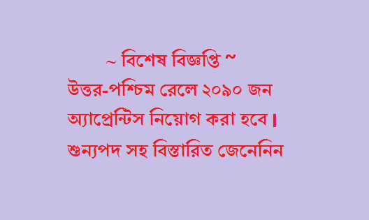 উত্তর-পশ্চিম রেলে ২০৯০ জন অ্যাপ্রেন্টিস নিয়োগ করা হবে । যে-কোনো একটি ইউনিটের জন্য আবেদন করতে পারবেন।