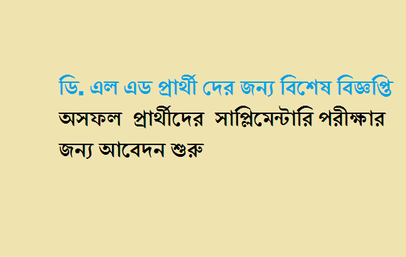 রাজ্যে দু বছরের ডিএলএড কোর্সের পরীক্ষায় যাঁরা অসফল হয়েছেন বা সেই সমস্ত candidate রা যদি কোর্স কমপ্লিট করতে চান তাহলে সাপ্লিমেন্টারি পরীক্ষা দিতে হবে তাঁদের ওই পরীক্ষায় বসার জন্য অনলাইন আবেদন করতে হবে আগামী ১০-১১ ডিসেম্বরের মধ্যে। এই দু-লিঙ্কের যে-কোনোটিতে: www.wbbpe.org বা http://wbprimaryeducation.org