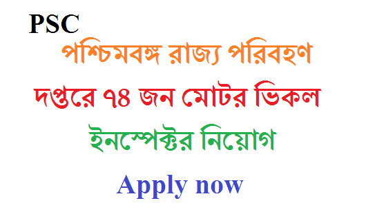 পশ্চিমবঙ্গ রাজ্য পরিবহণ দপ্তরে ৭৪ জন মোটর ভিকল ইনস্পেক্টর নিয়োগ করা হবে। প্রার্থী বাছাই করবে ওয়েস্ট বেঙ্গল পাবলিক সার্ভিস কমিশন। বিজ্ঞপ্তি নম্বর: ১/ ২০১৯। । বিস্তারিতভাবে জানানো হল।